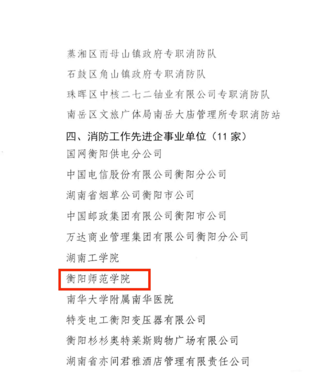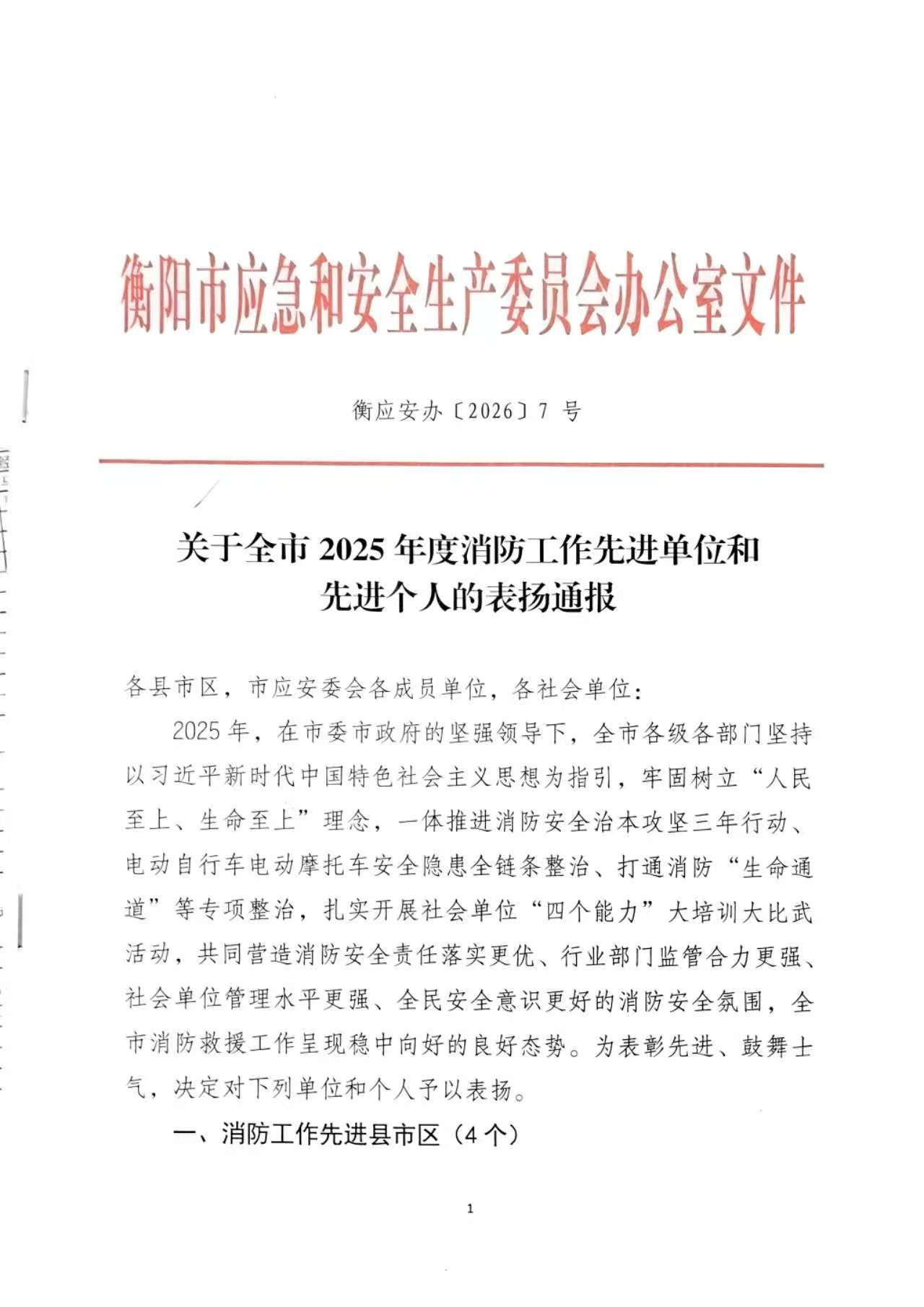 近日,衡阳市应急和生产安全委员会办公室发布表彰通报,yL23411永利集团官网登录成功获评全市2025年度消防工作先进企事业单位,这是对yL23411永利集团官网登录校园消防安全工作的充分肯定与高度认可。